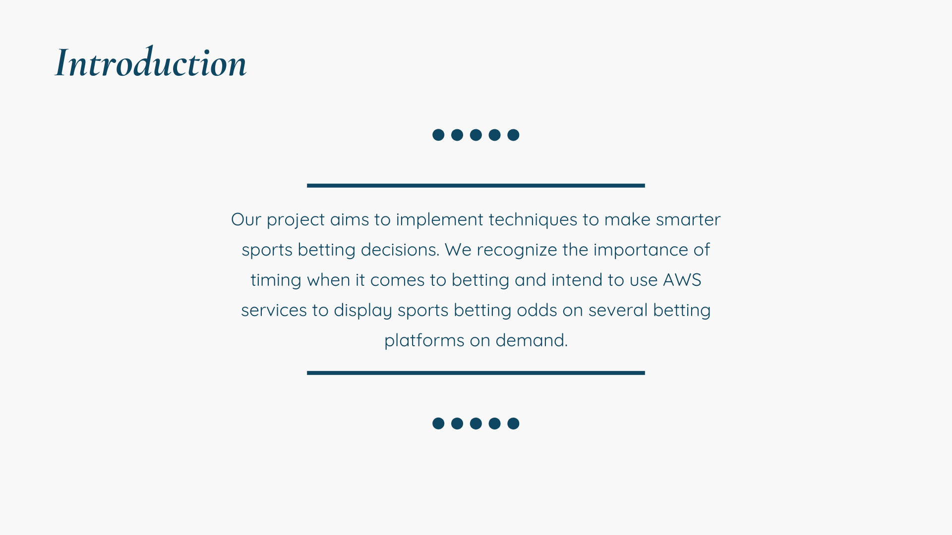 While there were plenty of challenges—like AWS Lambda’s limitations with Python packages such as pandas, our free trial token limits, and the learning curve that comes with working in the cloud—we built a system we were proud of. Our final product can help people make smarter betting decisions and gave me hands-on experience applying cloud services to solve real problems. Scroll down to check out our slides and see exactly how it all came together.