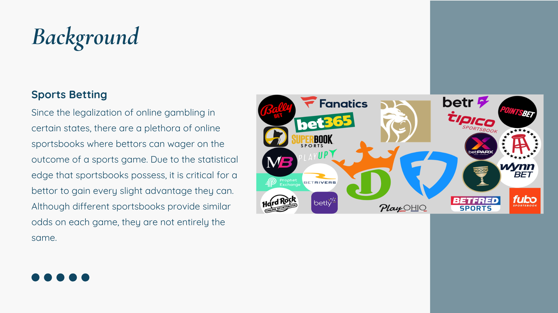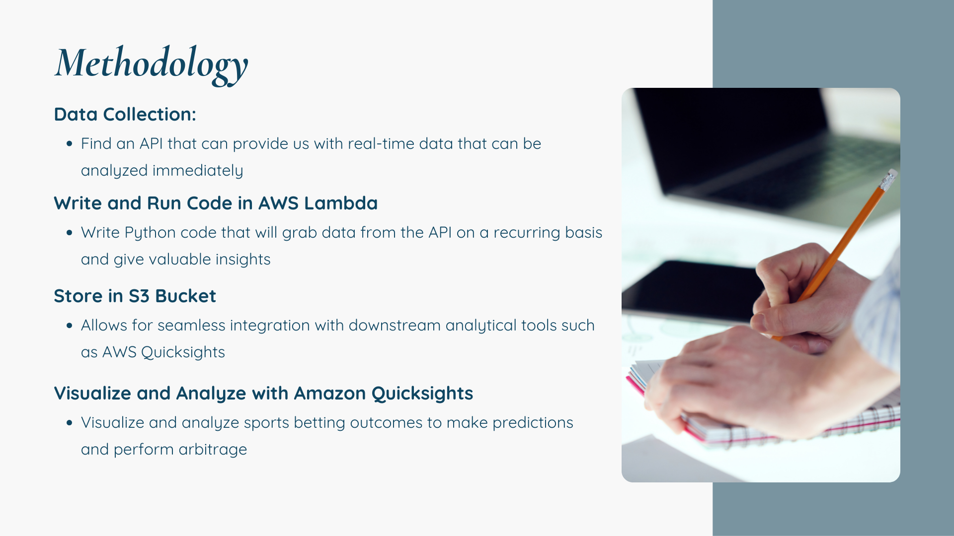 During my Cloud Computing class, my team and I decided to dive into something we were all genuinely interested in—sports betting odds. With so many sportsbooks offering different lines, we saw an opportunity to bring automation and analytics into the mix. The goal was to build a system that could collect real-time odds from multiple sportsbooks, find the best ones for each game, and even identify potential arbitrage opportunities where a bettor could guarantee profit regardless of the outcome. This project allowed me to turn what I learned from earning the AWS Cloud Practitioner certification into something practical, using tools like AWS Lambda, S3, and QuickSight to bring our idea to life.