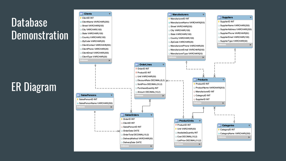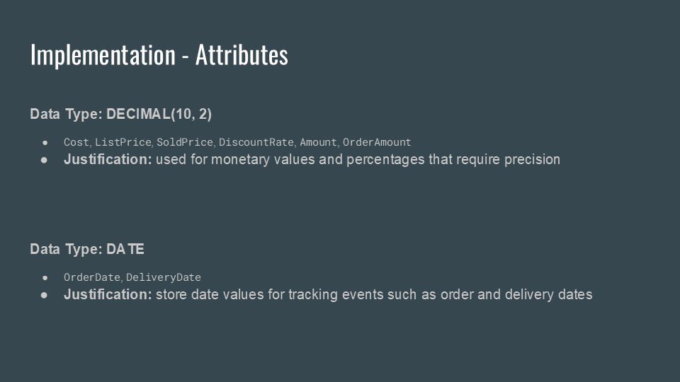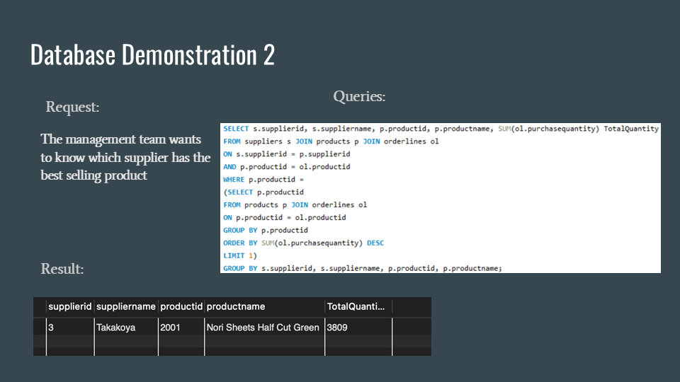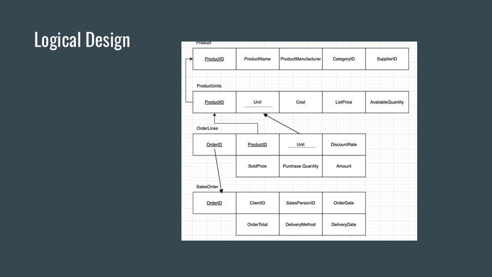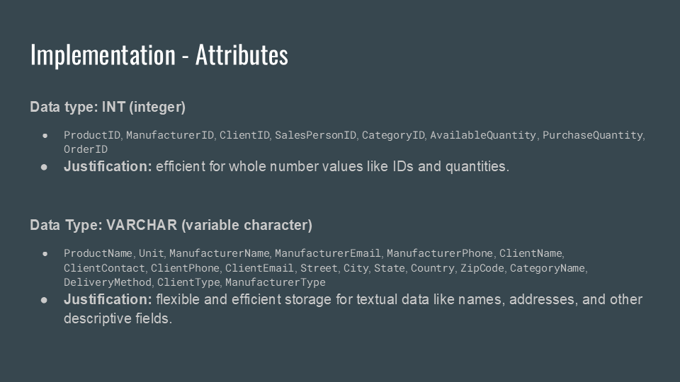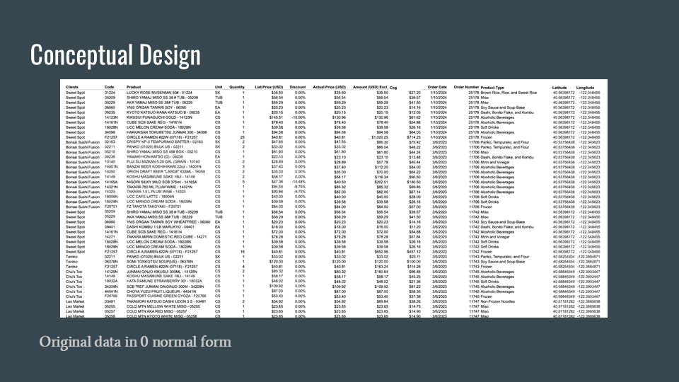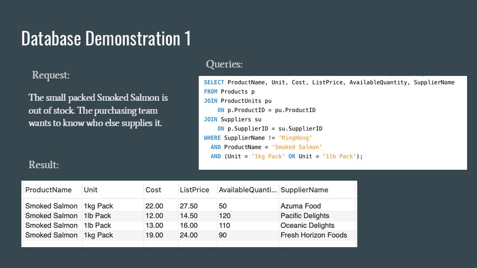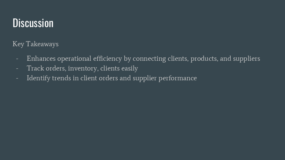 We then applied normalization—specifically, Third Normal Form (3NF)—to ensure the data was structured logically and without redundancy. With our schema in hand, we used SQL to build tables, define constraints, and populate them with sample records that mirrored NA Food’s real-world data (the SQL script used for this process can be found here). Finally, we tested our design by running queries that answered practical questions, such as which products had the highest discount rates and which sales reps were performing the best. Below, you’ll find the slides from our final presentation, showcasing our methodology, the final database design, and some of the most useful queries. The company went on to use the SQL database we created in their daily operations.