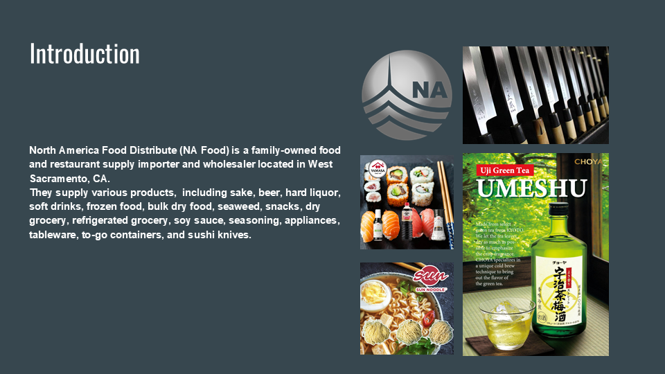For my Data Management class, we were tasked with creating a fully normalized relational database for a real company. My team chose NA Food Distribute, a wholesaler in West Sacramento, because one of our members had inside access to their operations data. We kicked off the project by mapping out the company’s sales and warehouse processes, translating them into an Entity-Relationship (E-R) diagram that captured everything from product categories to supplier relationships and order details.