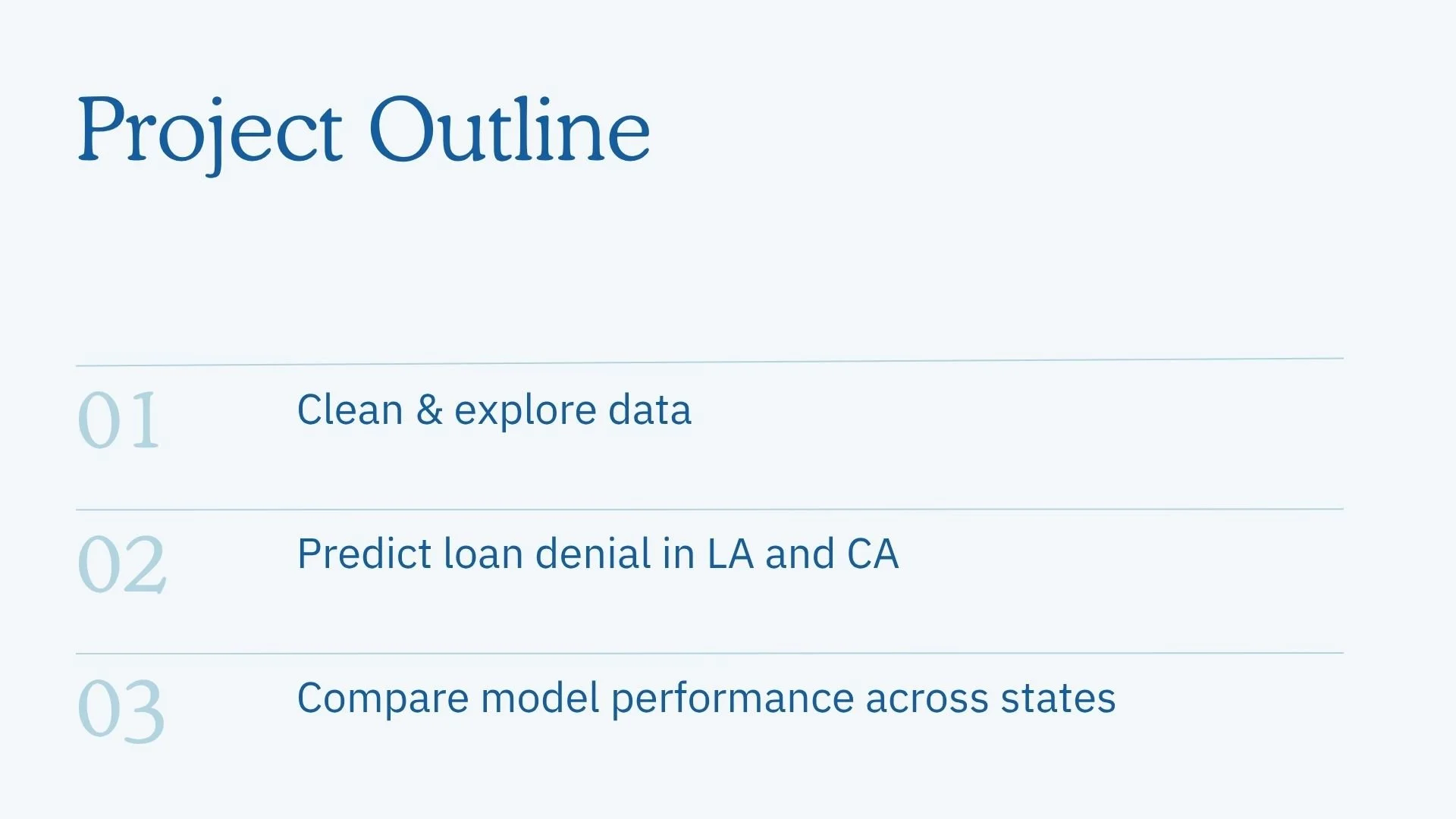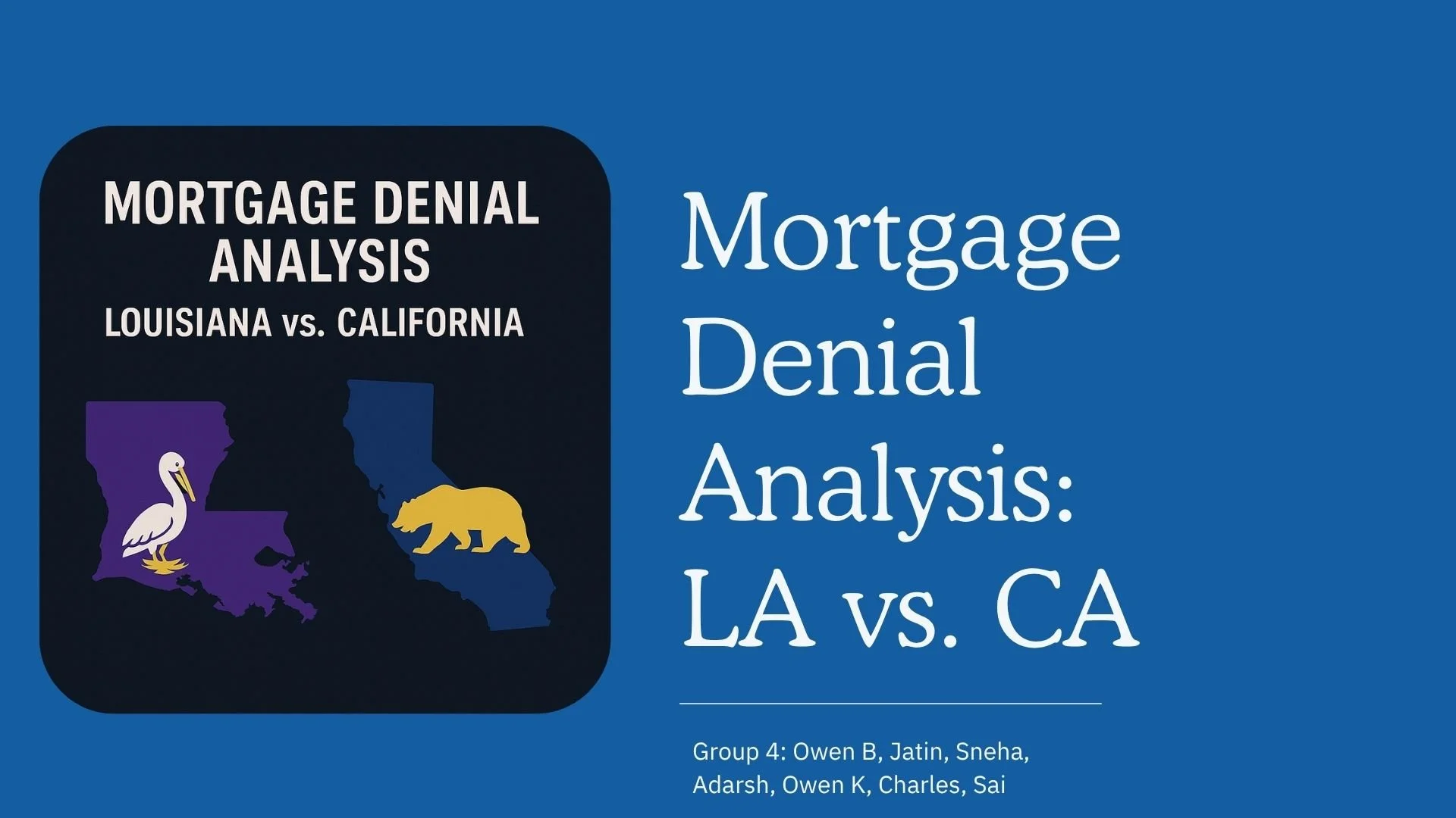 For this project in my Financial Analytics class, I worked on a team to analyze mortgage denial patterns in Louisiana and California using public lending data. Our goal was to predict loan approval outcomes and explore how demographic features impacted those predictions across states.