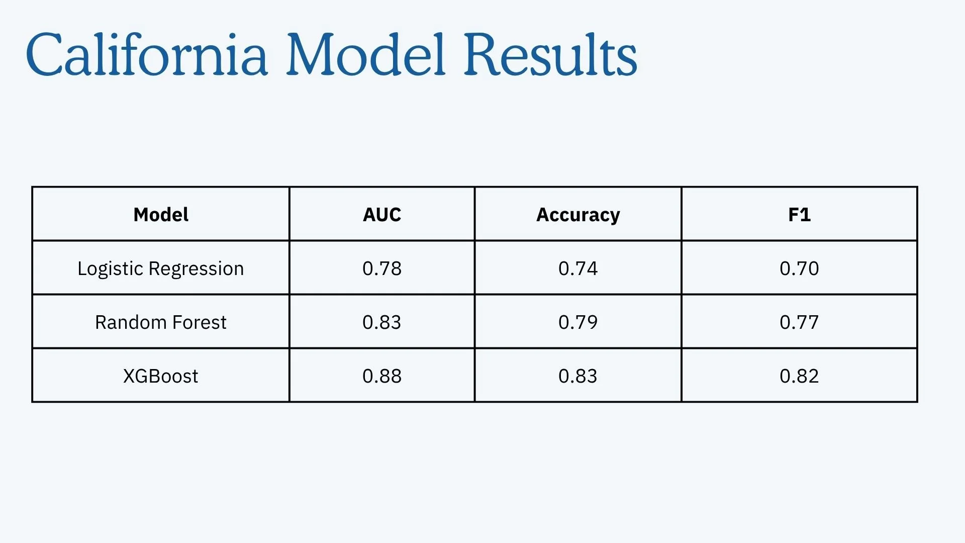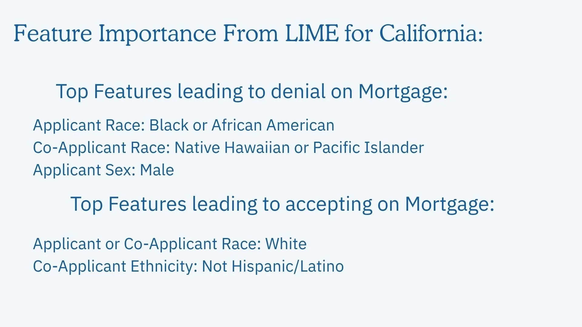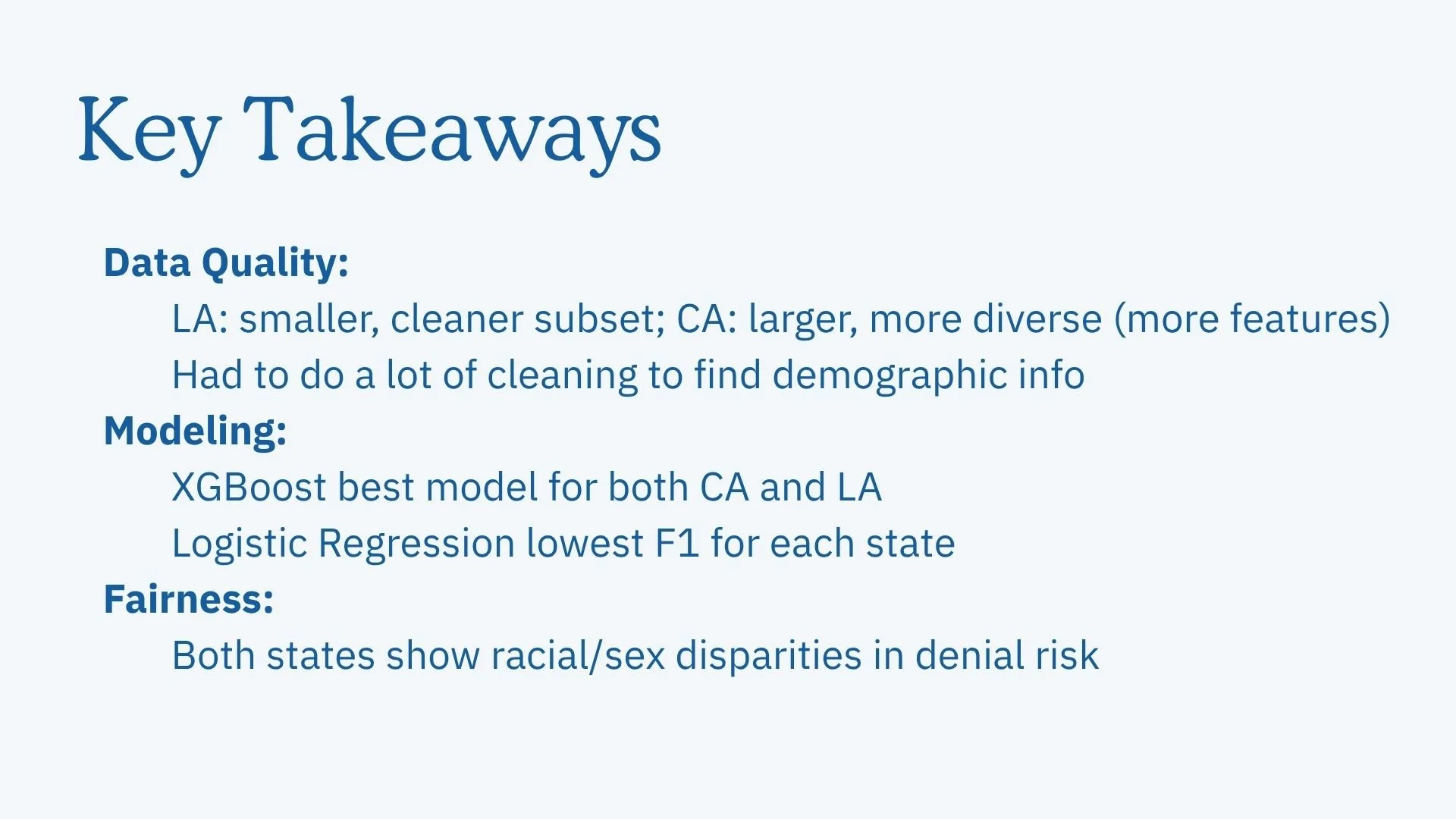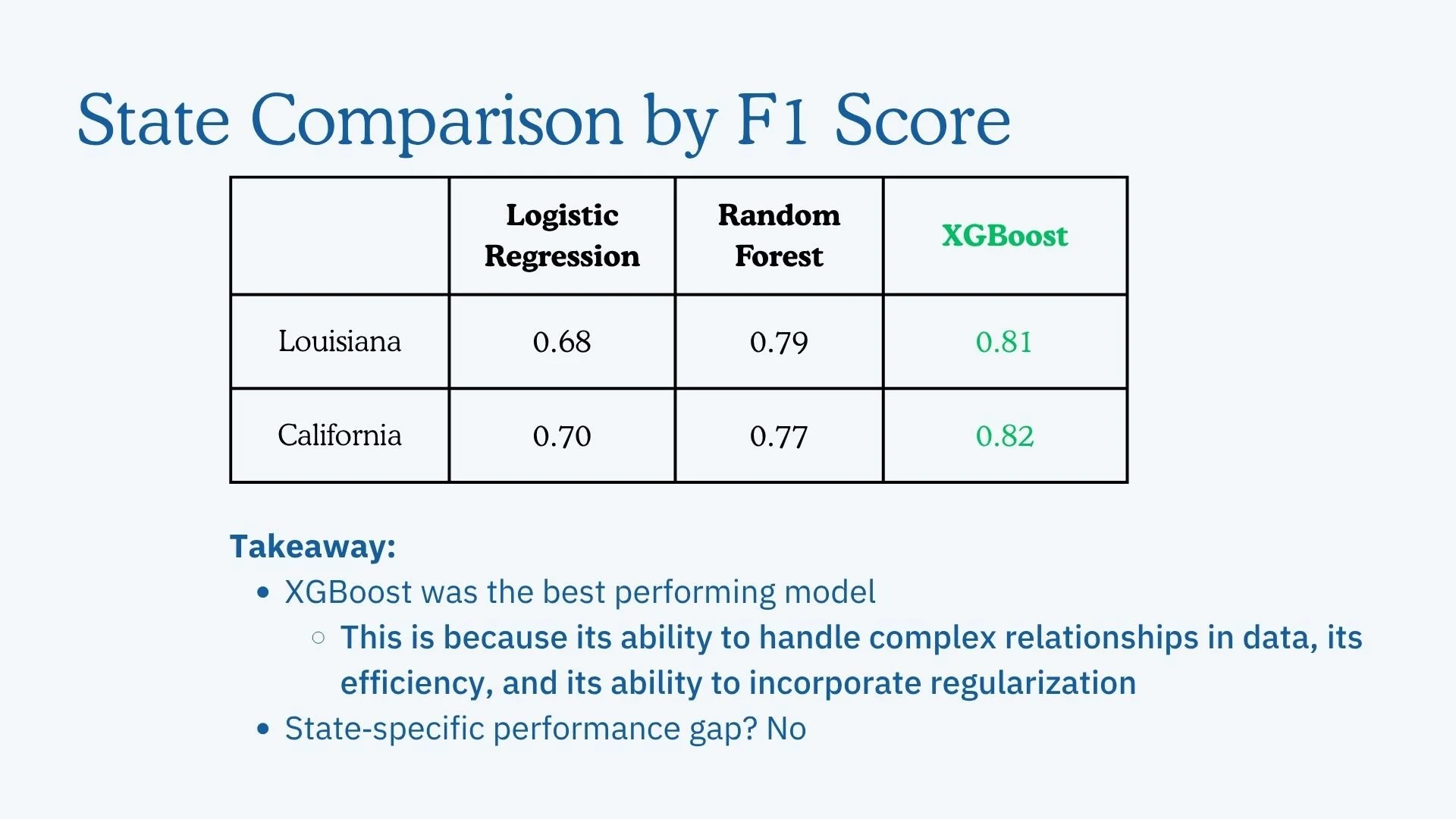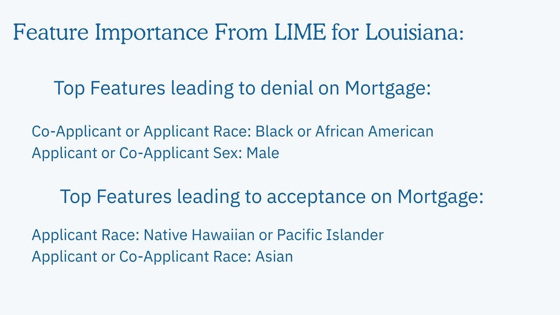 Using this cleaned dataset, we trained three models for each state: Logistic Regression, Random Forest, and XGBoost. XGBoost consistently outperformed the others, achieving an F1 score of 0.81 for Louisiana and 0.82 for California. We used LIME to interpret model outputs and identify top predictors of denial and approval.