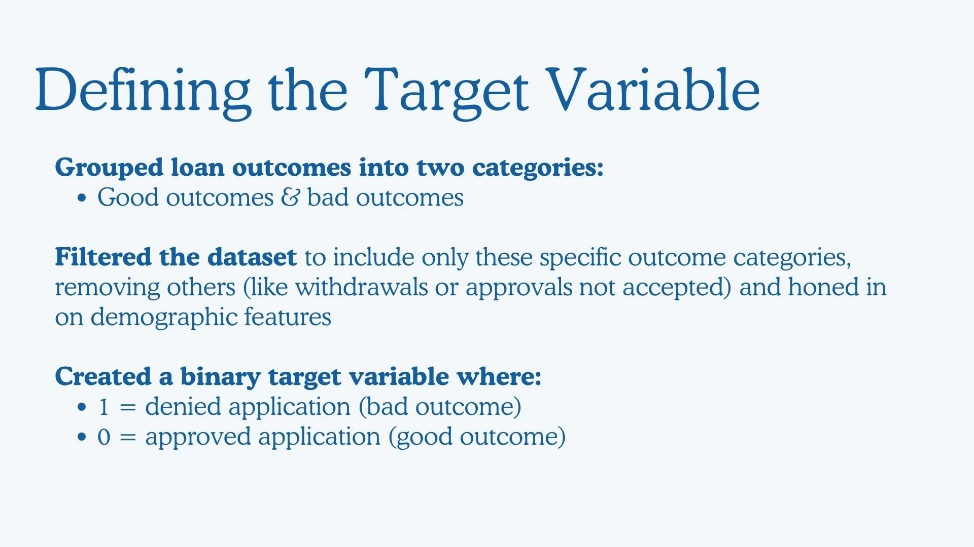 We started by cleaning and preparing the data: dropping rows with missing income values, removing empty columns, scaling numerical variables like loan amount and income, and one-hot encoding categorical demographics. We then defined a binary target variable where 1 indicated a denied loan application and 0 indicated approval.
